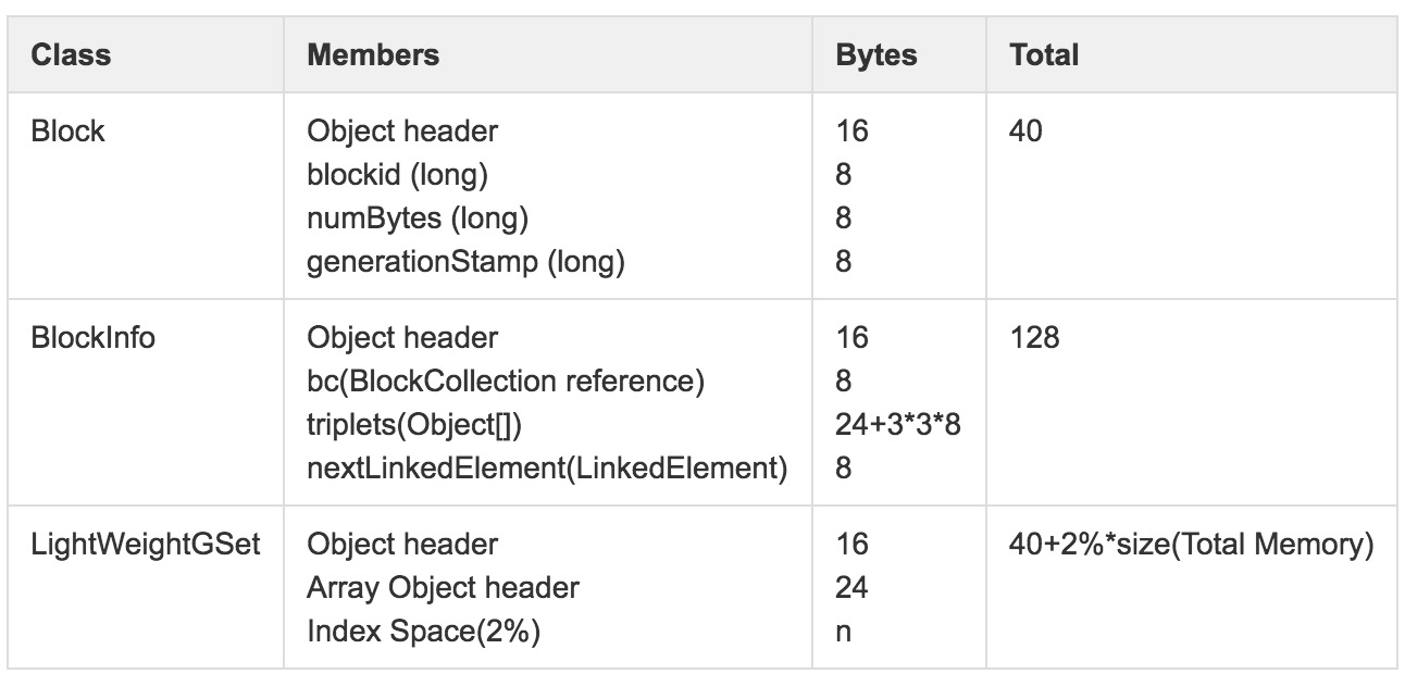 十堰市有几家网站公司,网页设计与自学教程,北京建筑公司排名,邢台做网站哪儿好前言 《HDFS NameNode内存全景》中#xff0c;我们从NameNode内部数据结构的视角#xff0c;对它的内存全景及几个关键数据结构进行了简单解读#xff0c;并结合实际场景介绍了NameNode可能遇到的问题#xff0c;还有业界进行横向扩展方面的多种可借鉴解决方案。 事实上我们从NameNode内部数据结构的视角对它的内存全景及几个关键数据结构进行了简单解读并结合实际场景介绍了NameNode可能遇到的问题还有业界进行横向扩展方面的多种可借鉴解决方案。 事实上对NameNode实施横向扩展前会面临常驻内存随数据规模持续增长的情况为此需要经历不断调整NameNode内存的堆空间大小的过程期间会遇到几个问题 当前内存空间预期能够支撑多长时间。何时调整堆空间以应对数据规模增长。增加多大堆空间。另一方面NameNode堆空间又不能无止境增加到达阈值后与机型、JVM版本、GC策略等相关同样会存在潜在问题 重启时间变长。潜在的FGC风险。由此可见对NameNode内存使用情况的细粒度掌控可以为优化内存使用或调整内存大小提供更好的决策支持。 本文在前篇《HDFS NameNode内存全景》文章的基础上针对前面的几个问题进一步对NameNode核心数据结构的内存使用情况进行详细定量分析并给出可供参考的内存预估模型。根据分析结果可有针对的优化集群存储资源使用模式同时利用内存预估模型可以提前对内存资源进行合理规划为HDFS的发展提供数据参考依据。 内存分析 NetworkTopology NameNode通过NetworkTopology维护整个集群的树状拓扑结构当集群启动过程中通过机架感知通常都是外部脚本计算逐渐建立起整个集群的机架拓扑结构一般在NameNode的生命周期内不会发生大变化。拓扑结构的叶子节点DatanodeDescriptor是标识DataNode的关键结构该类继承关系如图1所示。 图1 DatanodeDescriptor继承关系 在64位JVM中DatanodeDescriptor内存使用情况如图2所示除特殊说明外后续对其它数据结构的内存使用情况分析均基于64位JVM。 图2 DatanodeDescriptor内存使用详解 由于DataNode节点一般会挂载多块不同类型存储单元如HDD、SSD等图2中storageMap描述的正是存储介质DatanodeStorageInfo集合其详细数据结构如图3所示。 图3 DatanodeStorageInfo内存使用详解 除此之外DatanodeDescriptor还包括一部分动态内存对象如replicateBlocks、recoverBlocks和invalidateBlocks等与数据块动态调整相关的数据结构pendingCached、cached和pendingUncached等与集中式缓存相关的数据结构。由于这些数据均属动态的形式临时存在随时会发生变化所以这里没有做进一步详细统计结果存在少许误差。 根据前面的分析假设集群中包括2000个DataNode节点NameNode维护这部分信息需要占用的内存总量 64 114 56 109 ∗ 16∗ 2000 ~4MB 在树状机架拓扑结构中除了叶子节点DatanodeDescriptor外还包括内部节点InnerNode描述集群拓扑结构中机架信息。 图4 NetworkTopology拓扑结构内部节点内存使用详解 对于这部分描述机架信息等节点信息假设集群包括80个机架和2000个DataNode节点NameNode维护拓扑结构中内部节点信息需要占用的内存总量 44 48) ∗ 80 8 ∗ 2000 ~25KB 从上面的分析可以看到为维护集群的拓扑结构NetworkTopology当集群规模为2000时需要的内存空间不超过5MB按照接近线性增长趋势即使集群规模接近10000这部分内存空间~25MB相比整个NameNode JVM的内存开销微乎其微。 NameSpace 与传统单机文件系统相似HDFS对文件系统的目录结构也是按照树状结构维护NameSpace保存的正是整个目录树及目录树上每个目录/文件节点的属性包括名称name编号id所属用户user所属组group权限permission修改时间mtime访问时间atime子目录/文件children等信息。 下图5为Namespace中INode的类图结构从类图可以看出文件INodeFile和目录INodeDirectory的继承关系。其中目录在内存中由INodeDirectory对象来表示并用List children成员列表来描述该目录下的子目录或文件文件在内存中则由INodeFile来表示并用BlockInfo[] blocks数组表示该文件由哪些Blocks组成。其它属性由继承关系的各个相应子类成员变量标识。 图5 文件和目录继承关系 目录和文件结构在继承关系中各属性的内存占用情况如图6所示。 图6 目录和文件内存使用详解 除图中提到的属性信息外一些附加如ACL等非通用属性没有在统计范围内。在默认场景下INodeFile和INodeDirectory.withQuotaFeature是相对通用和广泛使用到的两个结构。 根据前面的分析假设HDFS目录和文件数分别为1亿Block总量在1亿情况下整个Namespace在JVM中内存使用情况 Total(Directory) (24 96 44 48) ∗ 100M 8 ∗ num(total children) Total(Files) (24 96 48) ∗ 100M 8 ∗ num(total blocks) Total (24 96 44 48) ∗ 100M 8 ∗ num(total children) (24 96 48) ∗ 100M 8 ∗ num(total blocks) ~38GB 关于预估方法的几点说明 1. 对目录树结构中所有的Directory均按照默认INodeDirectory.withQuotaFeature结构进行估算如果集群开启ACL/Snapshotd等特性需增加这部分内存开销。 2. 对目录树结构中所有的File按照INodeFile进行估算。 3. 从整个目录树的父子关系上看num(total children)就是目录节点数和文件节点数之和。 4. 部分数据结构中包括了字符串按照均值长度为8进行预估实际情况可能会稍大。 Namespace在JVM堆内存空间中常驻在NameNode的整个生命周期一直在内存存在同时为保证数据的可靠性NameNode会定期对其进行Checkpoint将Namespace物化到外部存储设备。